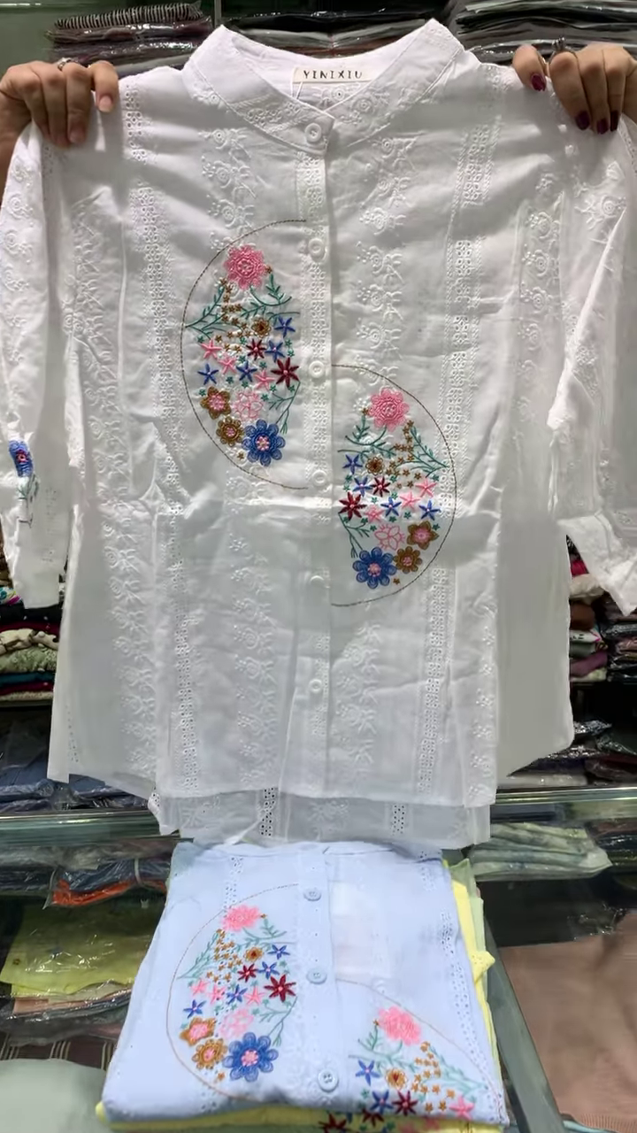 This exquisite white cotton blouse showcases masterful craftsmanship with its delicate blend of schiffli embroidery and vibrant floral needlework. The elegant design features a sophisticated mandarin collar and full-button front closure, creating a refined silhouette that transitions seamlessly from casual to semi-formal occasions.